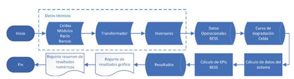 En la Figura 5 se presenta un diagrama de flujo para la evaluación de la condición de los sistemas BESS a través de KPis. Inicialmente los datos técnicos de los componentes del sistema son ingresados, posteriormente se cargan los datos operacionales obtenidos de las mediciones registradas por el sistema BMS, los datos son procesados y se calculan los KPIs.