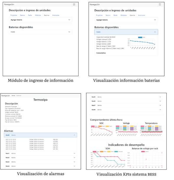 En estos pasos se establece un modelo de gestión de activos BESS basado en datos del fabricante y con la capacidad de integrarse a la plataforma de gestión de activos desarrollada por la Universidad Nacional de Colombia. renobat es una herramienta web de monitoreo de sistemas BESS que evalúa a través de indicadores los niveles de voltaje, temperatura, estado de carga (SOC), corrientes, estado de salud (State ofHealth). de las baterías y sus diferentes agrupaciones (celda, módulos, rack, banco). Esta herramienta advierte visualmente al usuario si los indicadores se encuentran fuera del rango establecido por el usuario o el fabricante del equipo.