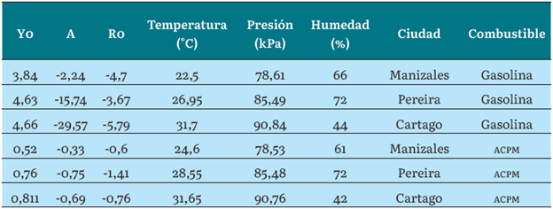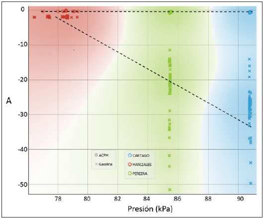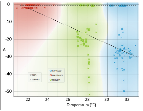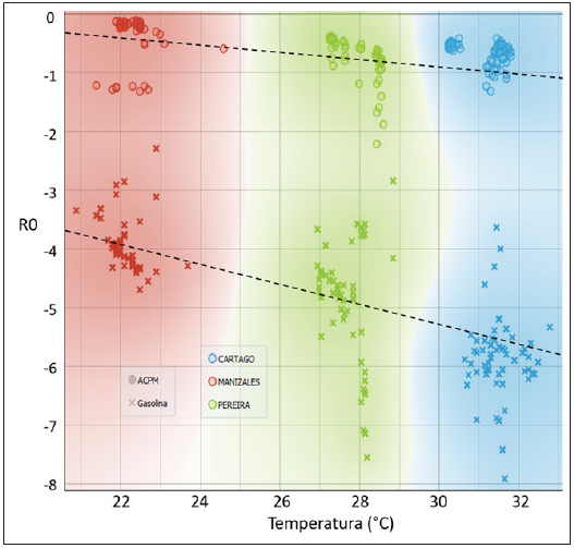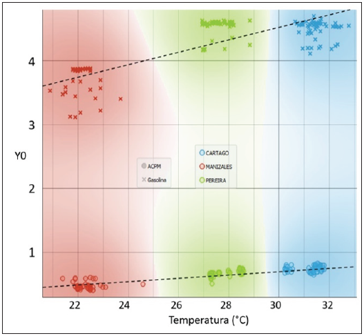 Las gráficas de dispersión en las Figuras 8, 9 y 10 muestran de manera común el comportamiento de los atributos -yo, Ro y A- con respecto a la temperatura, y la Figura 11, el atributo A con respecto a la presión atmosférica. Las regiones sombreadas en rojo, verde y azul, corresponden a las ciudades de Manizales, Pereira y Cartago, respectivamente. Adicionalmente, los datos marcados con círculos corresponden a ACPM, y los marcados con equis son gasolina.