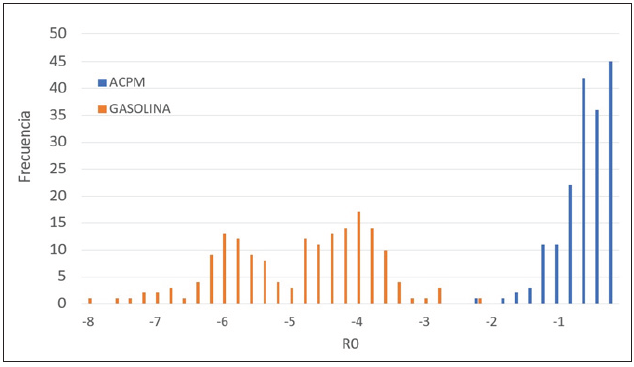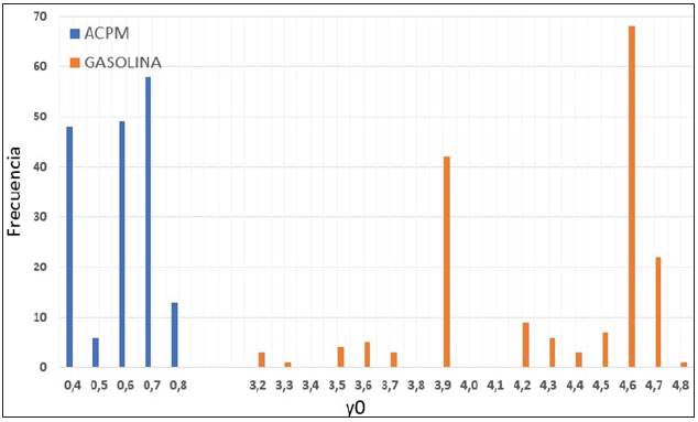 Adicionalmente, se generaron gráficas que muestran la densidad de frecuencia en los atributos yo, A y Ro. Para tal fin se usó la opción Distributions contenida en el software ORANGE; así se pudo observar las diferencias de magnitud entre los combustibles para un mismo atributo. En las Figuras 12, 13 y 14 se muestran los resultados obtenidos tanto para gasolina como para ACPM.