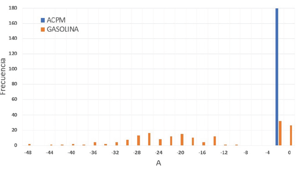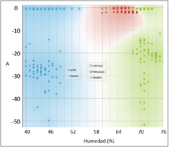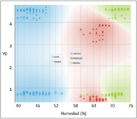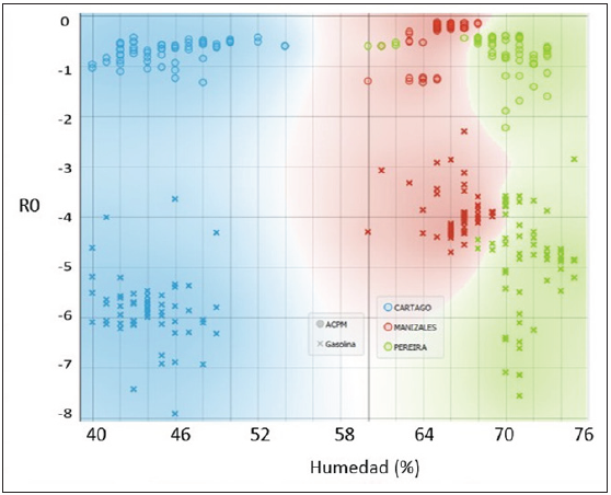 El análisis de los datos, mediante las gráficas de dispersión, permite reconocer la sensibilidad que tienen los parámetros de la gasolina -Ro, yo y A- frente a las variaciones de humedad (Figuras 17, 18 y 19). Asimismo, en estas figuras se observa una menor sensibilidad de los parámetros del ACPM frente a dichas variaciones. Las gráficas de dispersión y de densidad muestran que los atributos -Ro, yo y A- no se traslapan y que son altamente diferenciables, lo que demuestra la razón por la cual con un solo sensor de detección de GLP fue suficiente para discriminar entre gasolina y ACPM.
