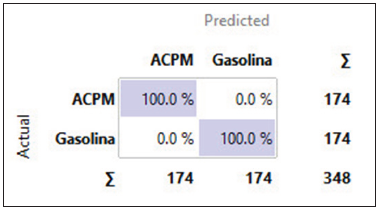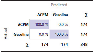 De la respuesta de la matriz de confusión para el método KNN (Figura 15) se determinó que la tasa de verdaderos positivos (TPR) fue de 100 %, la tasa de falsos positivos (FPR) fue de 0 °%, la tasa de verdaderos negativos (TNR) fue de 100 °%, la tasa de falsos negativos (FNR) fue de 0 °%. En consecuencia, la exactitud (E) obtenida fue de 1, como figura en la ecuación 3.