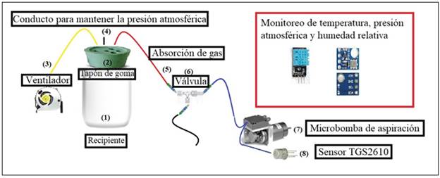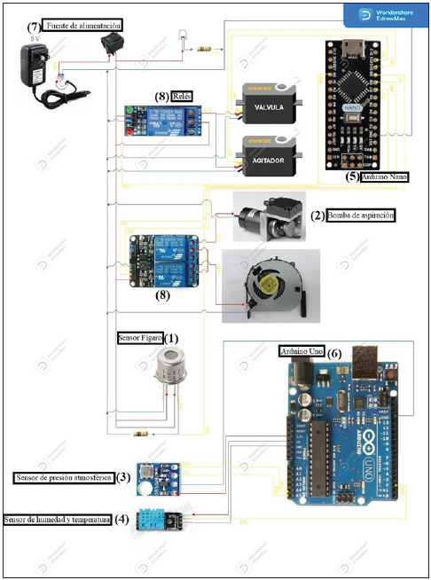 En la Figura 2, se presenta un esquema general del sistema eléctrico y electrónico que se desarrolló para la NE, en el cual se distinguen los siguientes elementos: un sensor Fígaro (1), una bomba de aspiración (2), un sensor de presión atmosférica (3), un sensor de humedad y temperatura (4), sistemas electrónicos digitales para la adquisición de los datos entregados por los sensores (5) y, para el manejo de las operaciones de mezclado y apertura de válvulas (6), una fuente de alimentación eléctrica (7) y relés para el manejo de los motores que tiene el sistema (8).