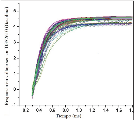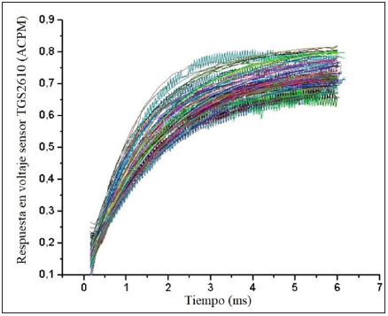 En las Figuras 5 y 6 se presentan las curvas suavizadas para la respuesta en voltaje del sensor Fígaro con respecto al tiempo para los ensayos realizados.