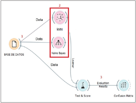 Para la FD se utilizó la herramienta de software ORANGE de uso libre, la cual está basada en el lenguaje de programación Python. Dos técnicas supervisadas de análisis de datos fueron empleadas -KNN y Naive Bayes-, y la base de datos que alimenta el software fue organizada de acuerdo con la configuración que el programa requiere.