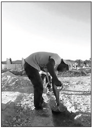 Se evaluaron las actividades correspondientes a excavación de zanja, colocación de block en muro en primeras filas, de bovedillas en techo y de piso de cerámica. Como resultado de la aplicación del método REBA se pudo observar que en todos los casos se obtuvo una alta puntuación en las partes del cuerpo correspondientes al Grupo A, que incluye tronco, cuello y piernas (Tablas 1, 4, 5, 8 y 11). Las puntuaciones más altas se tuvieron, en forma consistente, para la postura del tronco (T), por medio de la medición del ángulo de flexión del torso respecto a la vertical. Se hace la observación de que se debe buscar que este ángulo tienda a cero para que el trabajador permanezca lo más erguido posible, en una posición natural fisiológica. En todos los casos observados los trabajadores presentaron ángulos mayores a 60° -valor correspondiente a la categoría más crítica-, lo cual hizo que los trabajadores tuvieran puntuaciones de T igual a 4 o 5. Las flexiones en el tronco de los trabajadores se pueden apreciar en las Figuras 1, 2, 3 y 4.