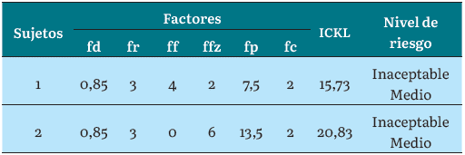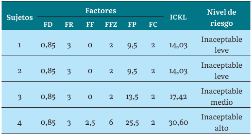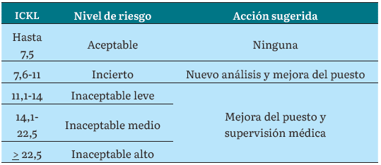 De acuerdo con el ICKL alcanzado, se asigna un nivel de riesgo ergonómico, cuya escala se muestra en la Tabla 2.