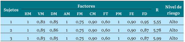El nivel de riesgo observado en los sujetos estudiados en ambas actividades fue alto (Tablas 3, Figure 7, ), acorde con lo cual, en ambas actividades se requiere tomar acciones inmediatas para disminuir el riesgo ergonómico.
