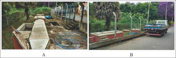 En los experimentos se utilizó efluente de un tanque séptico (TS) para tratamiento de efluentes domésticos del barrio Romão dos Reis, localizado en el perímetro urbano de Viçosa, cuya PTAR es operada por el Servicio Autónomo de Agua y Efluentes. La planta de tratamiento está conformada por unidades construidas in loco en concreto y ladrillo, cuya secuencia de tratamiento es: canasta metálica para remoción de sólidos de gran tamaño, desarenador con dos cámaras operadas en paralelo (figura 1A), TS de sección rectangular, filtro anaerobio y tanque para ecualización del efluente; el perfil de la PTAR con estas tres últimas unidades se puede apreciar en la figura 1B.