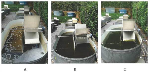 Las LAT se instalaron a 0,25 m sobre el suelo; contaron con pedales en acero inoxidable de 12 palas para agitación del agua, impulsados a través de un motor eléctrico de 1 CV; la rotación se reguló mediante un reductor acoplado al motor y fue controlada mediante inversor de frecuencia (marca WEG serie CFW-10), que proporcionó una velocidad del líquido entre 0,10 y 0,15 m/s.