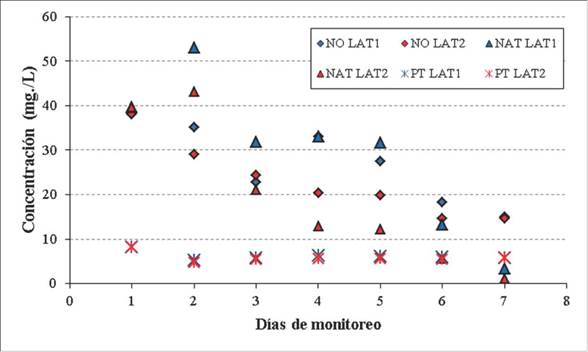 Como se puede observar en la figura 3, la mayor parte del tiempo la laguna LAT1 registró concentraciones de NO superiores a las medidas en la LAT2. La eficiencia de remoción de NO de la LAT1 fue de 60,8 %, mientras que en la LAT2 fue del 61,6 %.