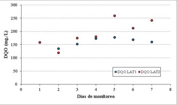 Como se observa en la figura 4, las concentraciones de DQO fueron casi siempre mayores en la LAT2; únicamente en el segundo día de muestreo se tuvo una concentración más elevada en la LAT1 (135 mg/L) que en la LAT2 (119 mg/L). A partir de las concentraciones iniciales y finales de la DQO, de 160 mg/L en la LAT1 y 242 mg/L en la LAT2, las eficiencias de remoción fueron, respectivamente, de -1,6 %, y -53,2 %, situación que puede explicarse por la alta presencia de biomasa algal que conforma una importante fracción de material orgánico activo en suspensión, pues el ensayo de DQO se hizo sobre muestras no filtradas.