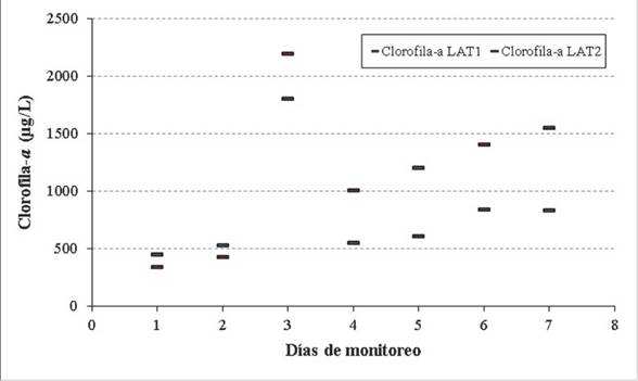 A partir del tercer día y durante la mayor parte del experimento, la LAT2 presentó mayores concentraciones de clorofila-α, como se aprecia en la figura 5, fruto de la utilización de una mayor cantidad de inóculo, que pudo propiciar el más rápido desarrollo de la comunidad algal. Tales concentraciones variaron como resultado de los niveles de radiación solar disponibles durante el experimento, con disminución importante durante el cuarto día (figura 5) debido a la alta presencia de neblina y lluvia.