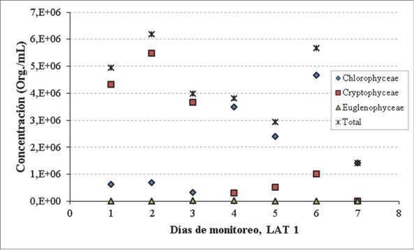 Durante los 7 días la LAT1 registró presencia de individuos de la clase Chlorophyceae, con densidad máxima de 4 650 100 organismos/100 mL, en el día cinco; representando una abundancia relativa (AR) del orden de 12,6, 11,1, 7,8, 91,4, 82,2, 82,1 y 100 % en relación a las clases identificadas entre los días 1 y 7. Únicamente en los primeros seis días se observó individuos de la clase Cryptophyceae, con una concentración máxima de 5 476 680 organismos/100 mL, en el día dos; la AR representada por esta clase en los seis días fue de 87,4, 88,7, 91,7, 8,0, 17,8 y 17,9 %, siendo la mayor en los tres primeros días del ensayo (figura 5 ). Solo entre el segundo y cuarto días se registró presencia de individuos de la clase Euglenophyceae, con un máximo de 23 958 organismos/100 mL en el día cuatro; la AR correspondiente a los organismos en dichos tres días fue de 0,2, 0,4 y 0,6 %.