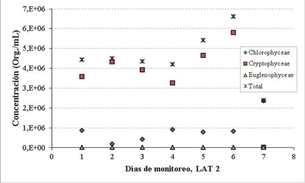 Durante los siete días del experimento, en la LAT2 se registraron individuos de la clase Chlorophyceae, alcanzando su máxima densidad de 2*364.866 organismos/100 mL el séptimo día del ensayo; esta clase representó una AR de 19,4, 3,9, 9,8, 21,8, 14,5, 12,3 y 99,5 %. Similar a lo observado en la LAT1, en los primeros seis días se registraron individuos de la clase Cryptophyceae, con una densidad máxima de 5 795 100 organismos/100 mL en el sexto día; la AR representada por esta clase en los seis días fue de 80,5, 96,1, 90,1, 77,8, 85,5 y 87,7 %. Solamente en los días 1, 3, 4 y 7 hubo presencia de individuos de la clase Euglenophyceae, con un máximo de 17 640 organismos/100 mL en el cuarto día; la AR correspondiente a la clase en tales días fue de 0,1, 0,1, 0,4 y 0,5 %. La figura 7 ilustra las concentraciones de los organismos de las tres clases identificadas en el experimento.