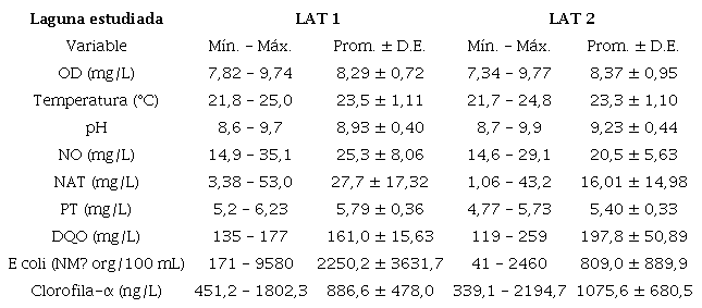 En las dos LAT se monitoreó diariamente, durante 7 días consecutivos, in situ, a las 8 a.m., las variables OD, método membrana electrodo; pH, método electrométrico y temperatura, método termoeléctrico. Posteriormente, se colectaron muestras del líquido tratado para análisis en laboratorio de las variables de calidad del agua: demanda química de oxígeno (DQO); PT; NO, NAT y clorofila-α, siguiendo las metodologías recomendadas por Standard Methods for the Examination of Water and Wastewater [14]. Las eficiencias de remoción de DQO, PT, NAT se calcularon a partir de la concentración medida en el primer día y las concentraciones registradas el séptimo día en las dos LAT; para el caso de NO se utilizó la concentración registrada el día 2 y las concentraciones finales del día 7 en las LAT1 y LAT2.