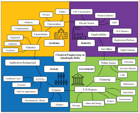 The diagnosis of the current state of chemical engineering in the Colombian Caribbean is approached from the AIGS model [26], based on the premise that the collected information will allow for the identification of gaps, improvement opportunities, and strategies to strengthen education and competencies in the training of chemical engineers. For this purpose, a systematic study was carried out [27], [28], which involved an organized search process using various bibliographic resources that address the background and information from the four sectors that form the alliance: academy, industry, government, and society (Figure 1). For the academic sector, the aim is to establish and characterize the offerings of the chemical engineering program in the Colombian Caribbean region [28]. The research examined the study curricula offered by chemical engineering programs within the region, drawing from the content available on the individual university websites. Alongside this, pertinent data encompassing the enrollment, admissions, and graduation figures over the preceding five years (2017-2022) for each program were meticulously compiled. This information was systematically sourced on an annual basis from the National Higher Education Information System (SNIES) [29], subsequently undergoing an averaging process to ensure accurate and concise data representation [30].