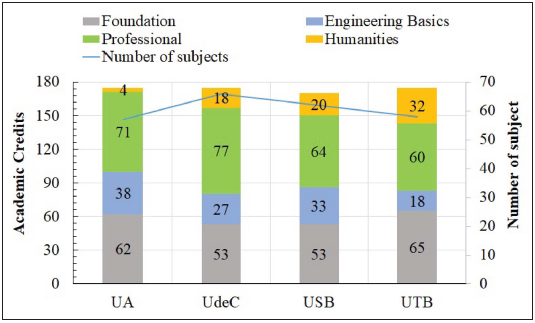 Moreover, concerning humanities subjects, UdeC has the lowest number of credits (4). This is because its curriculum is designed with a significant percentage of flexible components, allowing students to choose between humanities or professional areas.