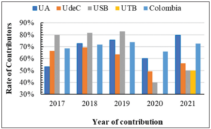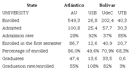 On the other hand, according to the nature of the institution, it is observed that the average number of enrollees in public institutions is significantly higher than in private institutions, however, public institutions do not have sufficient coverage to meet all the demand for registered, so they only admit around 30 % of the applicants. Due to this, the percentage of the admission rate, calculated as the ratio between admitted and enrolled students per semester, shows that private institutions (USB and UTB) have a higher admission rate than public ones. This phenomenon can generate a segregation and impact on the quality of the programs, since by having a limit of quotas the UdeC and the UA, promote the competitiveness in the applicants, for which, in general, these institutions will have students with better academic profile than private ones. The factors that influence this decision are primarily the cost of tuition, which is based on the student's socioeconomic level and is generally lower than that of the two private universities included in this study. Furthermore, the two IQ programs offered by public universities are accredited with high quality standards and have greater infrastructure for conducting experimental practices and research. Additionally, these universities have the advantage of being better positioned in research and innovation rankings [36], with a 30-position difference between public and private universities.