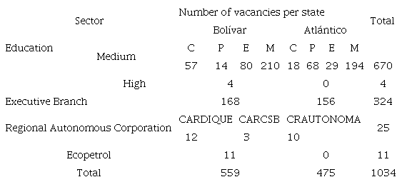 The positions detailed in the table specifically target chemical engineers. Teaching roles encompass fields such as chemistry, physics, environmental sciences, and mathematics, as well as administrative roles within the departments of Bolívar and Atlántico. Vacancies within higher education institutions are typically posted on the respective websites of these institutions and pertain to various engineering departments that seek candidates with profiles matching those of chemical engineers. Lastly, for positions at Ecopetrol, relevant information can be sourced directly from the company's official portal (https://jobs.ecopetrol.com.co/).