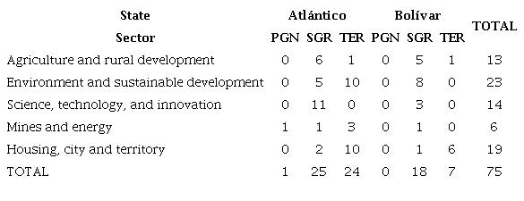 Another way for chemical engineers to participate and have an impact on society is through application or research projects. In Colombia, notable sources of funding for these purposes include the General Royalties System (SGR), the General National Budget (PGN), and the budget of each department (TER). Table 3 summarizes the results of recent projects related to chemical engineering that have been funded by the mentioned sources in the departments of Atlántico and Bolívar over the past five years. The results show that the SGR is the predominant source of project funding in both departments. It is also worth noting that the number of projects in Atlántico is double that of Bolívar, despite Bolívar having a larger territorial extension. This demonstrates that the department of Atlántico exhibits better development dynamics, including economic, academic, and social aspects, which have been driven by the local government.