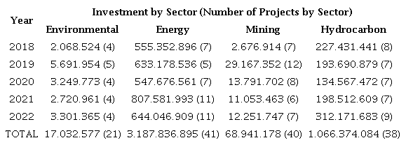 Another institution that has fostered projects to improve society's quality of life is the Ministry of Mines and Energy, as they are required by law to develop projects that provide energy connection to households and enhance its supply. In these projects, chemical engineers can contribute to national investments (Table 3) in the environmental, energy, hydrocarbon, and mining sectors. It can be observed that the two sectors with the highest investment budget in the last five years (2018-2022) are the energy sector (73.4 %) and the hydrocarbon sector (24.6 %). This aligns with the country's needs for a better and environmentally sustainable energy connection. The Colombian Caribbean coastal region will benefit in the coming years, as the current government will invest more, around 10 trillion dollars, in energy transition. This represents a 56.6% increase compared to previous years. The fundamental goal is to progress towards a fair, sustainable, and gradual energy transition that ensures the country's energy sovereignty.
