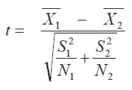 En la que las X son las medias de los grupos, S sus desviaciones estándar y N el número de integrantes de cada grupo. En realidad, el denominador es el error estándar de la distribución muestral de la diferencia entre medias.