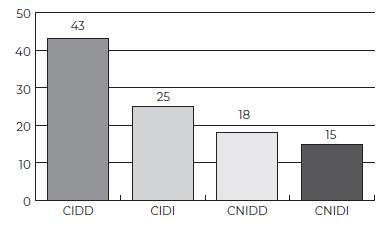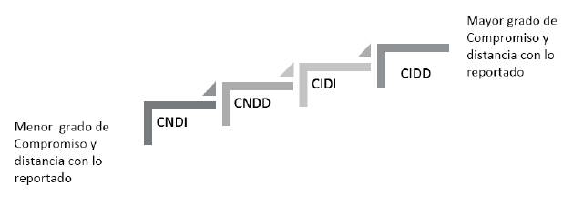 Frente a los patrones de uso ilustrados en la figura 3 y en consonancia con lo que ya hemos expuesto sobre la inserción de CI y CNI, tenemos que en los marcos teóricos analizados se manifiesta un claro patrón de elecciones relacionadas con un mayor grado de compromiso frente a las fuentes y una mayor distancia, comprendida esta como grado de interferencia sobre lo enunciado. Este comportamiento se ilustra de manera más clara si atendemos a la relación entre uso de CI y CNI, y la recurrencia al DD o al DI, ilustrado en la figura 4.