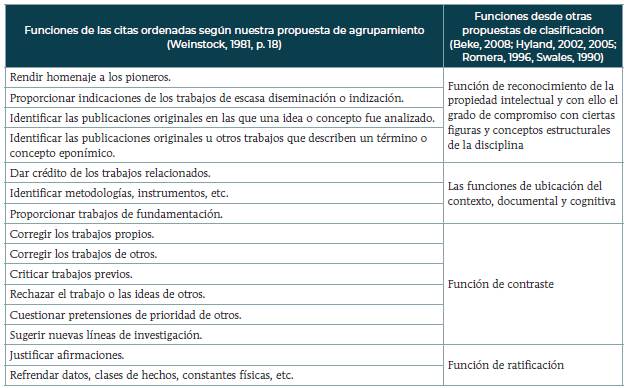 Funciones de las citas. Desde la perspectiva de la lingüística aplicada y con fines específicos, se cuenta con una amplia clasificación de las funciones de las citas (Beke, 2008; Hyland, 2002, 2005; Jacoby, 1987; Romera, 1996; Sánchez, 2013; Swales, 1990). Luego de cotejar algunas de estas propuestas, encontramos que son bastante similares. De hecho, algunas funciones pueden incluirse en otras o solaparse. En esta constatación, hemos decidido acoger la propuesta de Weinstock (1981, p. 18), quien presenta una exhaustiva lista de 15 funciones. En la tabla 1, se ordenan en relación con otras propuestas analizadas.