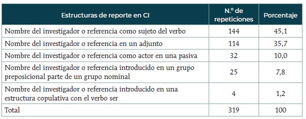 Estructuras de reporte en el uso de CI. En cuanto a las formas como se integra el nombre del autor en el enunciado de reporte, la tabla 2 muestra una tendencia a incluir el nombre del investigador como sujeto (45,1 %) o a ubicarlo en un adjunto (35,7 %).