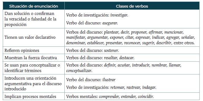 Verbos del discurso o verbos dicendi, entre ellos, opinar, considerar, criticar, advertir, afirmar, abordar, entre otros.