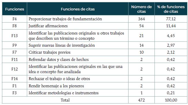 Funciones de la citas. Con respecto a las funciones de la citación en el corpus, tal como se aprecia en la tabla 4, en los marcos teóricos de los estudiantes predomina la función de citación 4: proporción de trabajos de fundamentación, con un promedio de uso muy significativo (77 %), frente a funciones como F8: Justificar afirmaciones (11 %) y F3: Identificar las publicaciones originales o trabajos donde aparece un concepto (4 %). El resto de funciones tiene una frecuencia de aparición muy baja en el corpus, de apenas el 4, 3, 2 y 1 %.