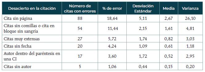 Como puede apreciarse en la tabla 5, el error más frecuente es la omisión de la página en citas directas, con un porcentaje del 20 %, lo que no se estima como una frecuencia alta. Es preciso indicar que para este error la desviación estándar es mayor que la media, lo cual indica la presencia de valores extremos en relación con una alta dispersión de los datos. Lo anterior se evidencia en el valor tan alto de la varianza ocurrida por la presencia de un dato extremo, es decir, un solo individuo suma el 32 % del total de los errores encontrados, mientras que el 48 % de la muestra no presenta este tipo de error (0 errores).