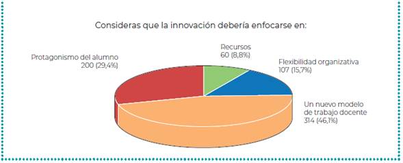 En los últimos años, los eventos sobre innovación se han centrado con frecuencia en la incorporación de "nuevas" tecnologías, y como bien explica Miguel Ángel Zabalza (en Zabalza y Zabalza Cerdeiriña, 2012), "el mundo de la tecnología y de los nuevos recursos que nos abren al amplio mundo de la información y la comunicación se ha ido adueñando de una gran parte del espacio y del protagonismo en el campo de las innovaciones educativas" (p. 91). En tal sentido, la encuesta permitió constatar que para el conjunto de nuestros profesores la innovación educativa no es sinónimo de tecnología, aunque la incluyen como una herramienta. Los docentes mayoritariamente coinciden en concebir la innovación con las siguientes características: