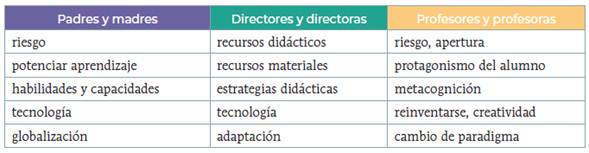 En todos los casos, el moderador aseguró la participación de todos actores y evitó el monopolio de la palabra de alguno de ellos. Los diálogos recogidos han resultado de gran riqueza y su análisis pormenorizado excede los límites de esta experiencia documentada. Sin embargo, cabe destacar las respuestas más coincidentes en cada grupo al pedirles dos palabras que ellos asociaban con el concepto de innovación educativa: