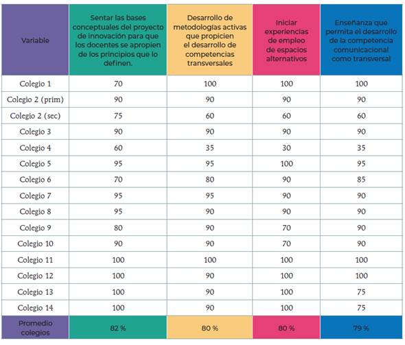 Por tratarse de contextos institucionales diversos, cada colegio elaboró su propio plan estratégico y sus directores se convirtieron en agentes del cambio. La experiencia recogida dejó evidencia de positivos resultados a partir de las sesiones de práctica reflexiva. Esos espacios sistemáticos propiciaron la capacidad de repensar la propia práctica y de aprender junto a otros profesionales. Las resistencias al cambio que en toda organización escolar se presentan como un obstáculo frente a la innovación se vieron reducidas. El trabajo colaborativo entre docentes generó un clima propicio, un ambiente donde cada uno se sintió apoyado para realizar iniciativas innovadoras. El proyecto Innovate tiene pocos años de vida y apenas un año de recorrido, pero sus incipientes resultados nos motivan para compartir esta experiencia documentada con la ilusión de animar a otras escuelas para lanzarse a la aventura de la coinnovación.