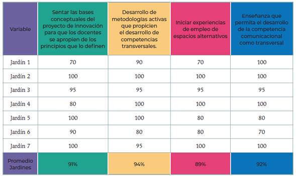 Previamente se habían acordado las variables e indicadores. A continuación, se ofrece el porcentaje de alcance de los objetivos de cada variable y sus indicadores en cada centro8.