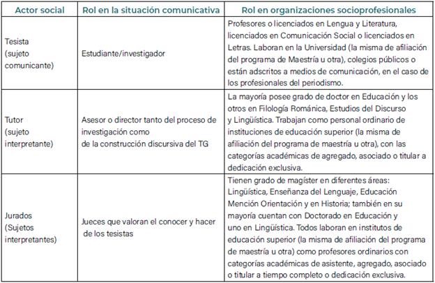 En la esfera de la actividad científica, situacional y discursiva, los participantes TGML se encuentran inmersos en una red de propósitos, relaciones dinámicas con el texto y roles que orientan sus prácticas. La Tabla 1 muestra a los actores sociales y sus roles tanto en el evento comunicativo como en las organizaciones socioprofesionales.