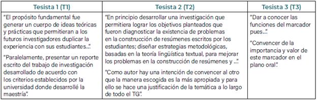Se evidencia, a través de las expresiones "el propósito fundamental" y "en principio", que los tesistas se plantean el logro de los objetivos de estudio y la correspondencia de la investigación con la disciplina, pues para que el TGML sea aprobado es imperioso demostrar dominio de los fundamentos teóricos de la lingüística. Además, buscan "paralelamente, presentar un reporte escrito del trabajo de investigación desarrollado de acuerdo con los criterios establecidos por la universidad donde desarrollé la maestría" (T1). El adverbio "paralelamente" implica que ambos propósitos son significativos e ideados por el tesista de manera simultánea, ya que escribir un TG supone "exponerse" ante una comunidad académica que lo evalúa (Carlino, 2005). El otro propósito identificado es convencer a los otros de la trascendencia del tema (beneficios que se aportan con el TG) y lo acertado de la metodología adoptada.
