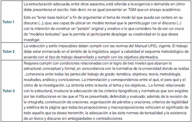 Por su parte, los tutores destacan el propósito de evaluar. Al respecto, en la Tabla 3 se develan las condiciones que estos sujetos interpretantes distinguen como necesarias para que el TG obtenga los estándares solicitados por las instituciones universitarias y la comunidad lingüística.