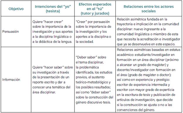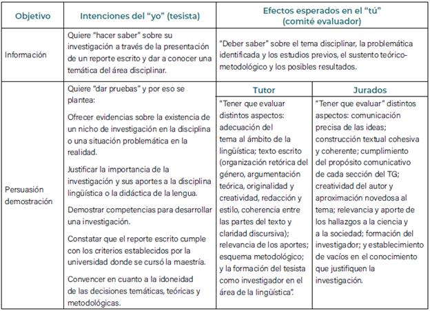 Indica la meta u objetivo que convoca la intención de los sujetos comunicantes (tesistas) en virtud de los sujetos interpretantes (tutores y jurados). En la Tabla 2 se presentan las intenciones de los tesistas identificadas en las encuestas.