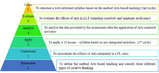 The authors opted for a qualitative methodology to discuss "how people interpret their experiences, how they construct their worlds, and what meaning they attribute to their experience" (Merriam & Tisdell, 2016). The qualitative aspects of the inquiry were appropriate because arts link experiences (e.g., aesthetical, spiritual, academic) to practice. On the other hand, action research was about what practitioners did in practice (Bradbury, 2010). Action research allowed us to take ownership of teaching since we worked directly with the pupils without the headteachers as intermediaries (O'Connor, Greene, & Anderson (2006). We saw the necessity to structure a syllabus drawing on theories, literature, research reports our diagnosis, and the results of our study. Bloom's Taxonomy guided the formulation of objectives and methodology (see Figure 1)