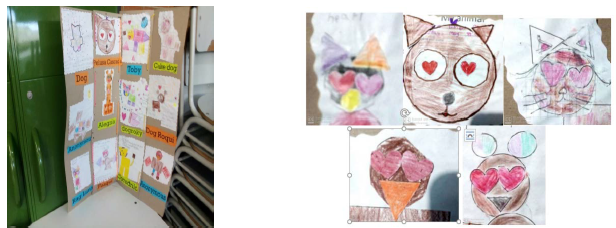 Another example was task 2. Artifacts display previous concepts of shapes and colors, and the new ones are animals. The pupils designed posters with geometric shapes (Figure 7). In the process, as Donaghy and Xerri (2017) suggest, we noticed that emojis supported visual literacy (Figure 8). Pupils acquired words, sounds, and structures that they could recall easily.