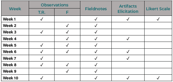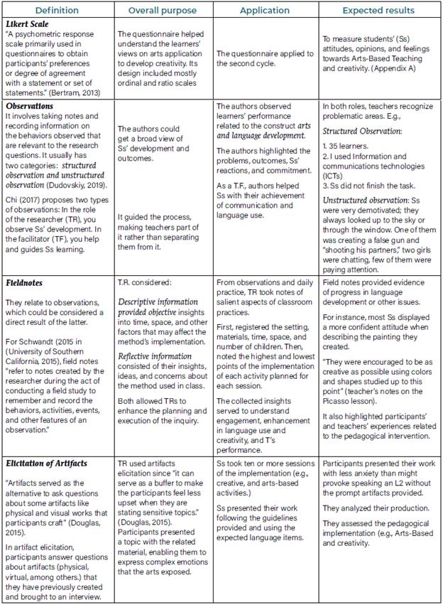 The authors found a gap while revising the literature and recent research studies. There is scarce documentation on the A.B.T. to inform the structuring of an L2 syllabus. On the other hand, there is no apparent connection between A.B.T. with creative development. Further studies should conceptualize Art-Based Teaching supported by empirical evidence. Table 1 offers readers a description of the research procedures and instruments that the authors used to address the problem identified and fill the literature gap.