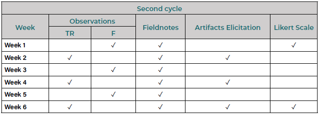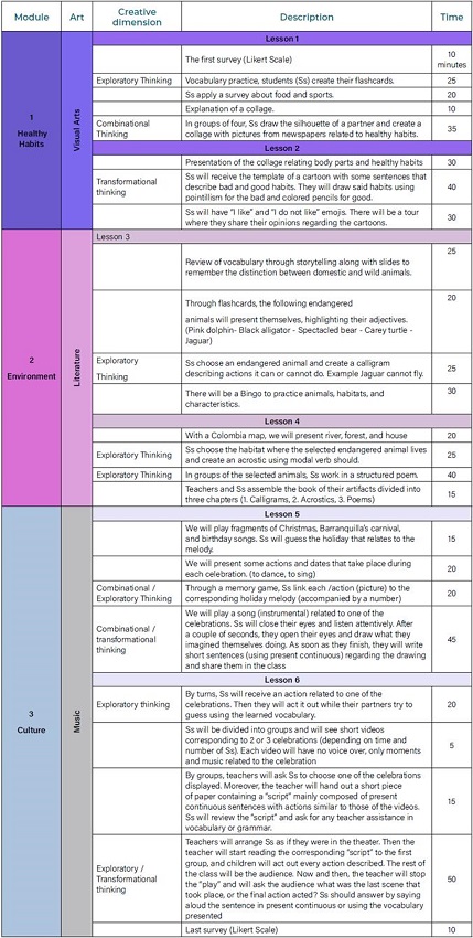 After implementing the first syllabus, we created the second cycle program (see Appendix C) based on preliminary results and data analysis. It took into account the Ministerio de Educación Nacional (M.E.N) guidelines, standards (M.E.N, 2006), and the suggested curricula (M.E.N, 2016). The syllabus contains three modules, each one divided into two lessons for a total of six sessions. Each class was built on prior knowledge with a sequential organization so that every task becomes purposeful. The chart displays first, the leading art form used in each module. Then, it shows the creative dimension, and third, a general description of each task and time.