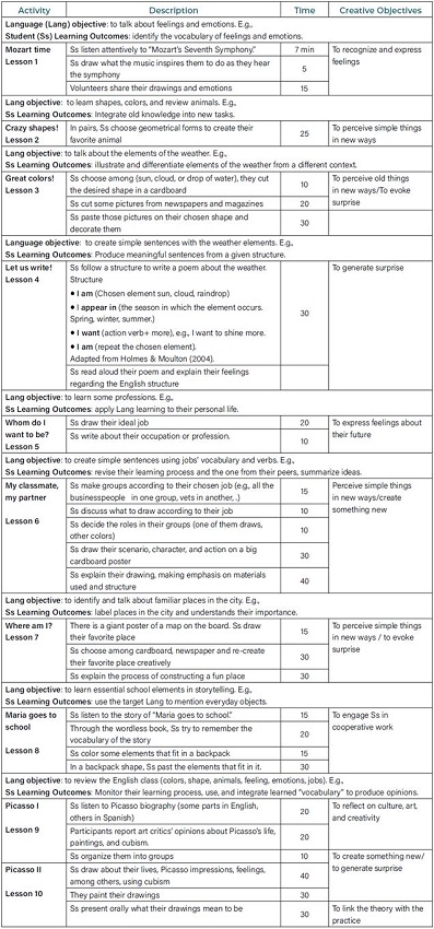 Our proposal's vision of the curriculum is "what actually goes on from moment to moment in the language classroom" (Nunan cited in Tudor, 2001, p. 29). It sets objectives, and the classroom is where we pursue these objectives in a controlled and focused manner. Thus, our first cycle syllabus (see Appendix B) comprises ten lessons. Each class describes procedures, the average time of the activities, the objectives regarding creativity, language, and the outcomes.
