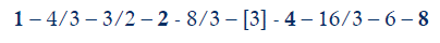El primer momento de articulación de las dos progresiones se realiza mediante la supresión de los términos repetidos en cada serie (señalados entre corchetes [ ] para mejor identificación) y disponiendo los números de las dos series en una única serie: