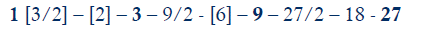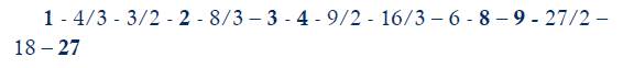 Si se aplica el procedimiento que corresponde a 1 y 2, o sea, a los primeros dos términos de la progresión doble hasta 27, se obtiene la escala completa del jeroglífico. El demiurgo toma las progresiones de razón común (2 y 3) por separado, pero la mediación va dando lugar a una única serie o progresión ascendente. Una vez que se agregan los intervalos de cuarta y quinta, la progresión doble queda así: