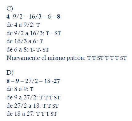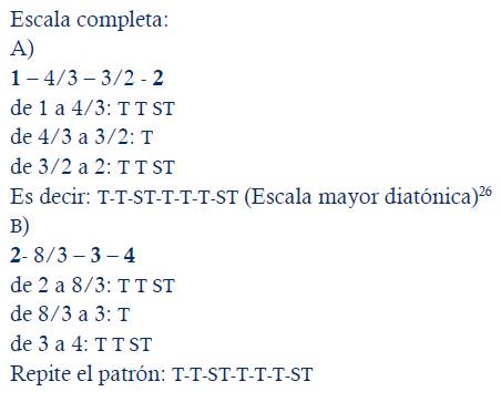 El resto faltante se deduce fácilmente. Dado que se sigue una progresión logarítmica, ese resto no puede ser otra cosa que el cociente entre 4/3 y 81/64, o sea: 256/243. Luego, si se multiplica la fracción 81/64 por el resto faltante, 256/243, se llega a 4/3. Entre 4/3 y 3/2 (entre cuarta y quinta) hay un tono, o sea, 9/8. Lo que va de 3/2 a 2 (el segundo tetracordio, de quinta a octava superior) es un calco de lo anterior, es decir, de 1 (tónica) a 4/3 (cuarta).