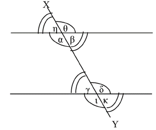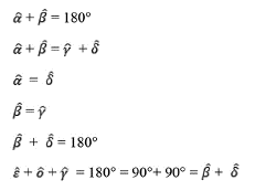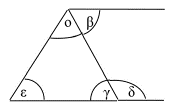 La relación que Merleau-Ponty intuye y es preciso comprobar es que la suma de los ángulos β y δ, surgidos de las líneas trazadas, es igual a 180°, lo que también es, evidentemente, igual a la suma de dos ángulos rectos y, también, igual a la suma de los ángulos internos del triángulo. La comprobación de esto se deduce de la proposición 29 del libro I de los Elementos de Euclides que Merleau-Ponty parece estar leyendo para expresar ciertas relaciones a partir de lo establecido por el geómetra. Allí Euclides (1991) explica que "la recta que incide sobre rectas paralelas hace los ángulos alternos iguales entre sí, y el [ángulo] externo igual al interno y opuesto, y los [ángulos] internos del mismo lado iguales a dos rectos" (p. 238) (figura 3). Esta proposición, algo confusa en una primera lectura, puede ser esquematizada del siguiente modo:
